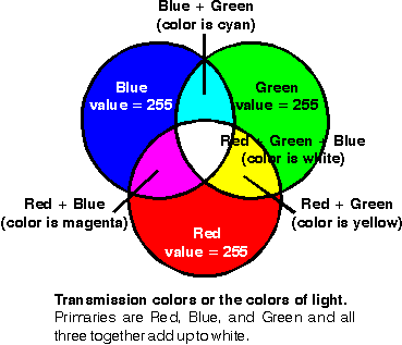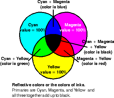 color is rendered by the medium you are using. A complete color range can be created by combining appropriate proportions of primary colors. For example, the computer may identify a particular orange as 255 Red, 125 Green, 33 Blue. (These primaries are the red, green, and blue used by a monitor or television.) The numbers represent the intensity of the illumination from black (0) to full color (255). Mixing full intensity of all three colors gives white. Unfortunately, when you're dealing with inks while the theory is similar, the details are different. The primaries are cyan (approximately Carolina a blue that Microsoft Word calls "turquoise"), magenta (a light purple that Word calls "pink"), and yellow. Full intensity of all ink colors (described as 100%) adds up to black. There is a correlation between the primaries of light or